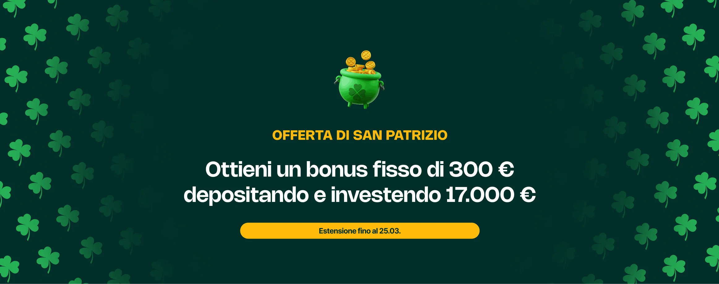 Lo spirito di San Patrizio è ancora vivo a Lendermarket. Abbiamo quindi esteso questo periodo speciale di festeggiamenti: ora hai tempo fino a mercoledì 25 marzo per far crescere il tuo portafoglio e richiedere il tuo bonus fisso di 300 €.